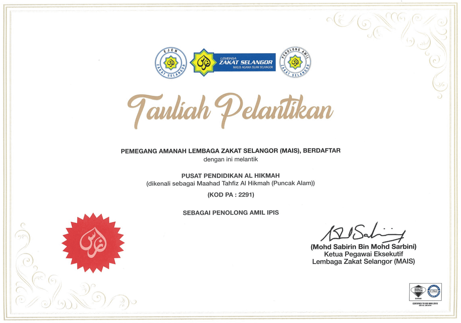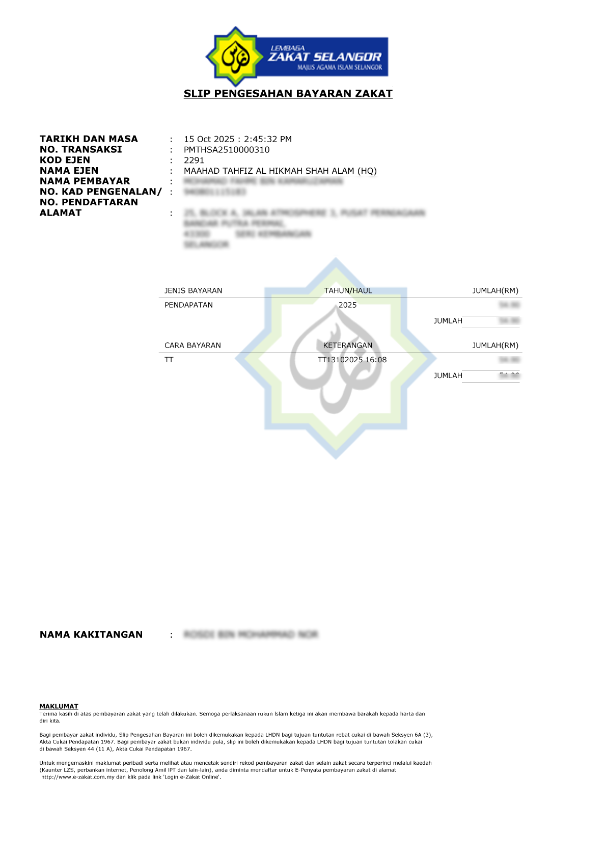 Pastikan setiap pembayaran, anda akan menerima resit daripada Lembaga Zakat Selangor